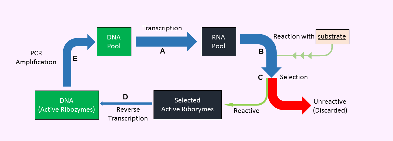 A general layout for an in vitro selection: Starting from step A, a DNA pool containing trillions of randomized DNA sequences is transcribed into RNA. Depending on their respective sequences, certain RNAs will fold into a shape that can be “functional” for a specific reaction with a given substrate. The entire pool is incubated with the substrate (B). Only the functional RNAs survive via their success with catalyzing the substrate for a specific reaction (C). The reactive RNAs are then reverse transcribed back into DNA to be amplified for the next round of selection (D, E).